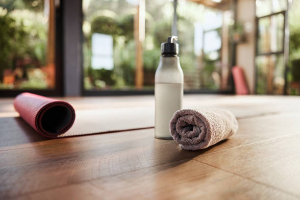 Water, towel and yoga mat in an empty fitness studio for wellness, mental health or inner peace closeup. Fitness, exercise and pilates with still life equipment on the floor of a gym for a workout